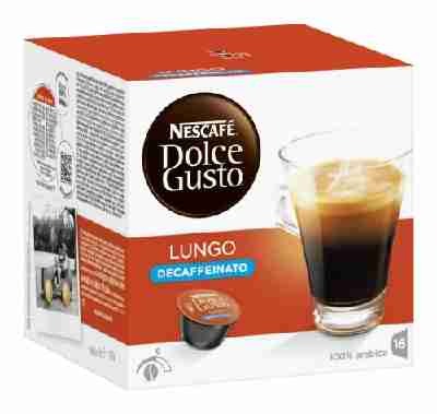 Nescafé Dolce Gusto Caffè Lungo Decaffeinato, Entkoffeiniert, Kaffee, Kaffeekapsel, 16 Kapseln:Sie lieben kräftigen aromatischen Kaffee und schätzen den Geschmack hochwertiger Bohnen? Auf Koffein möchten Sie allerdings verzichten? Dann gönnen Sie sich einen aromatischen Caffè Lungo in der koffeinfreien Variante. Inklusive 10 Original Dolce Gusto Genusspunkten. , Zutaten:Nescafé Dolce Gusto Caffè Lungo Decaffeinato, Entkoffeiniert, Kaffee, Kaffeekapsel, 16 Kapseln:Entkoffeinierter gemahlener Röstkaffee , Lieferumfang:3 x 1 Packung Dolce Gusto Caffè Lungo Decaffeinato mit 16 Kapseln für 16 Portionen Nettogewicht: 112g / Packung, 7g / Kapsel